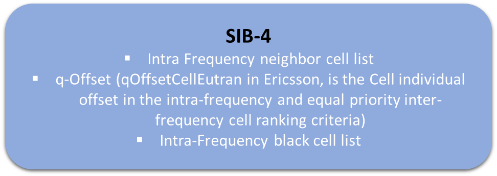 SIB-4 Contains information about the serving frequency and intra-frequency neighbouring cells relevant for cell re-selection (including cell re-selection parameters common for a frequency as well as cell specific re-selection parameters). Black listed cells are included in SIB-4.