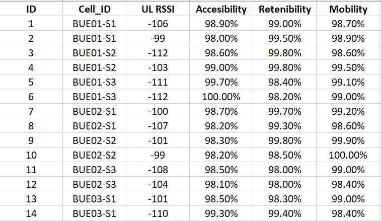 We will need two tables; the first one will have the data that will create the points on the map. Should have an unique identifier plus latitude and longitude columns as mandatory. In my case as I want to display cell data into a map, I need to include azimuth and some carrier information (later you will understand why). The second table should have all the data you want to display. Let me show you an example of both.