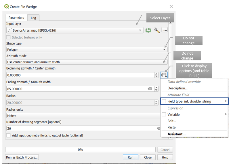 Beginning azimuth / Center azimuth is the azimuth I have in the map table. In this case I’ll click in the drop menu in the right and browse the fields in my table to select Azimuth.