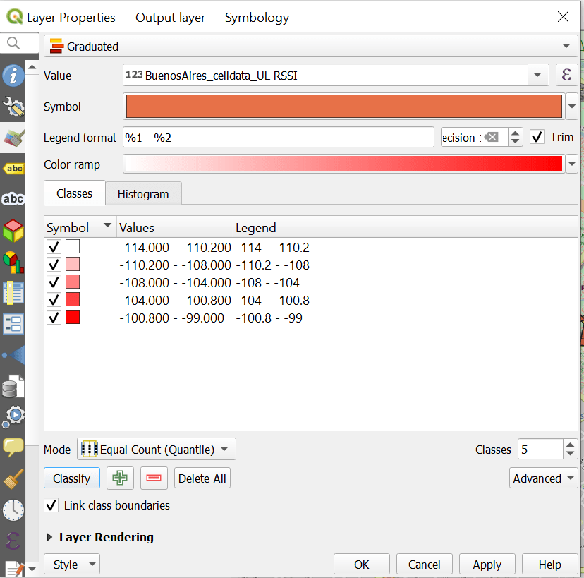 In my case, due the format of the field, I can map in a graduated map is UL RSSI. Check that the table is still the output layer, but I’m displaying the data table through the join I did before (how cool is that?). I just left everything default, then click “classify” then “apply” and finally “OK”.
