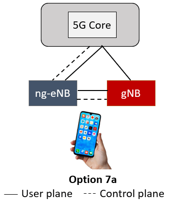 Option 7a: In this sub-option the 5G gNB is now connected to the 5GC. This link is only for user plane. In this option the bearer split is performed at the 5GC.