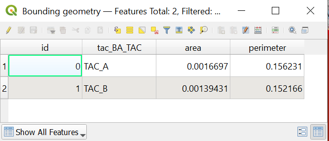 You can see in the result I get a new layer called Bounding_geometry that has the polygons that contains each TAC. If you right click on this layer you can find the attributes of the two polygons newly created: