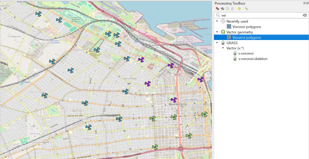 Method #2: The second method has mores steps, but the final result is way better than the previous one. Again you first need to go to Processing > Toolbox so the same window appears. But here you will choose “Voronoi Polygons” inside Vector Geometry folder:
