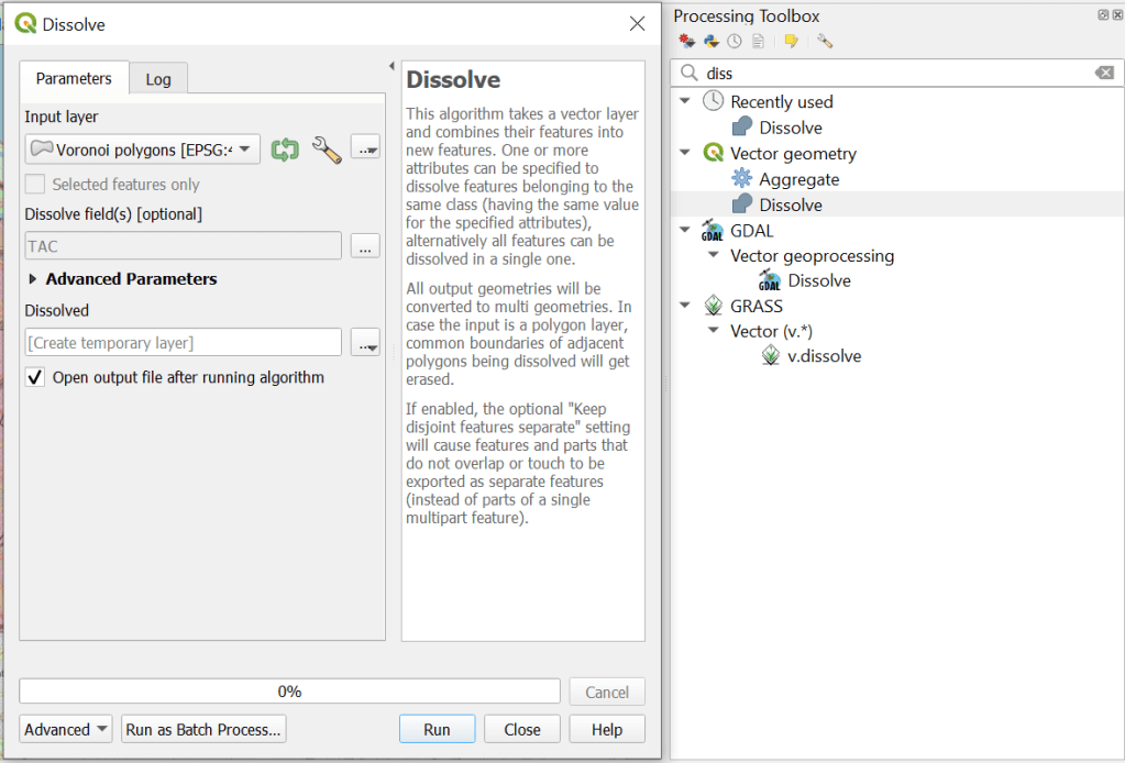 Select the Voronoi Polygons layer recently created and on the dissolve field select the common field you want to use for grouping your points. In my case I have selected TAC. Then hit run: