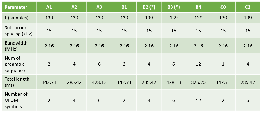 Some important facts about the Long-Sequence based preambles: they are meant to be used at carrier frequencies below 6 MHz (FR1); they enable long transmissions: 1 ms or longer and support two different subcarrier spacing: 1.25 MHz and 5 MHz.